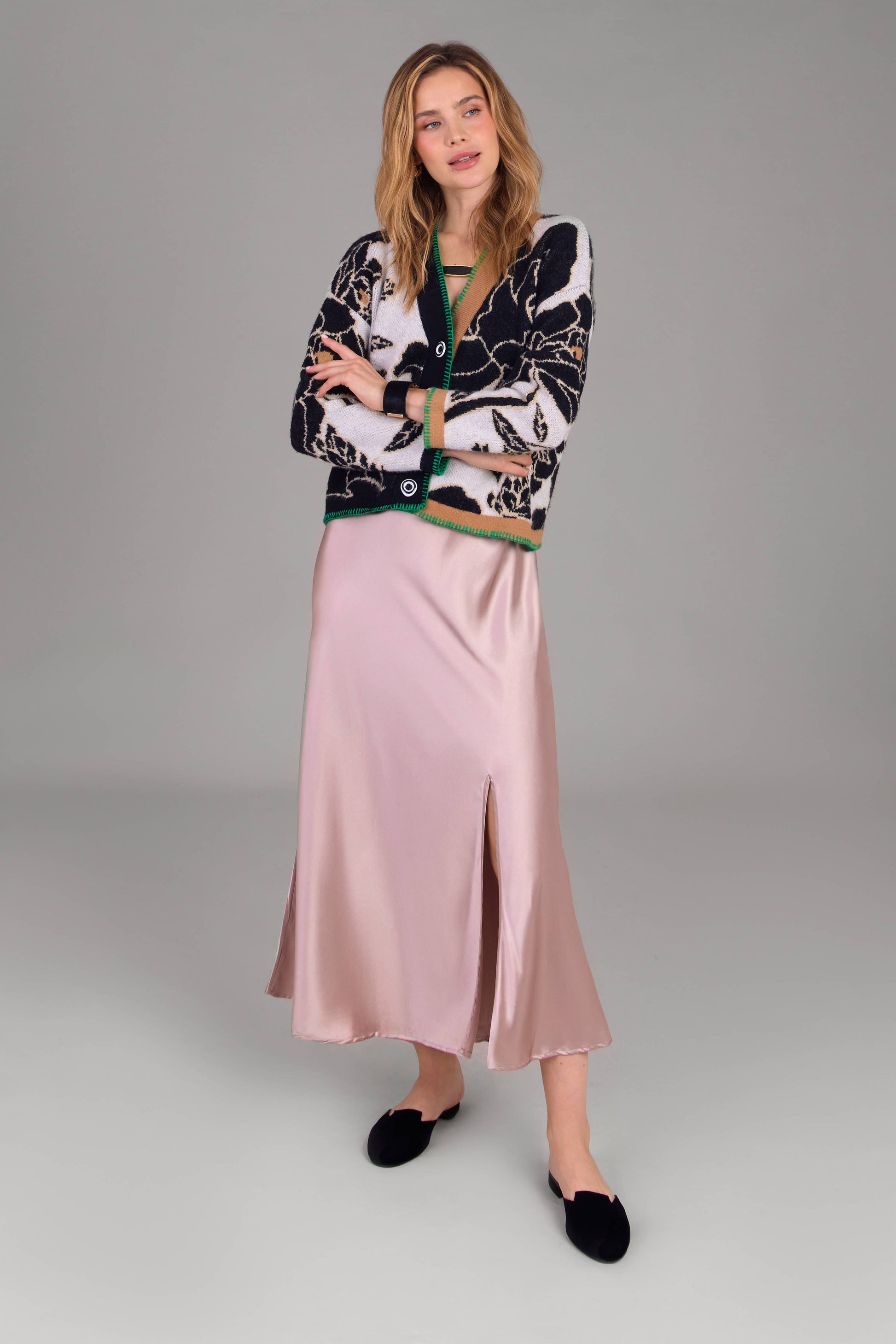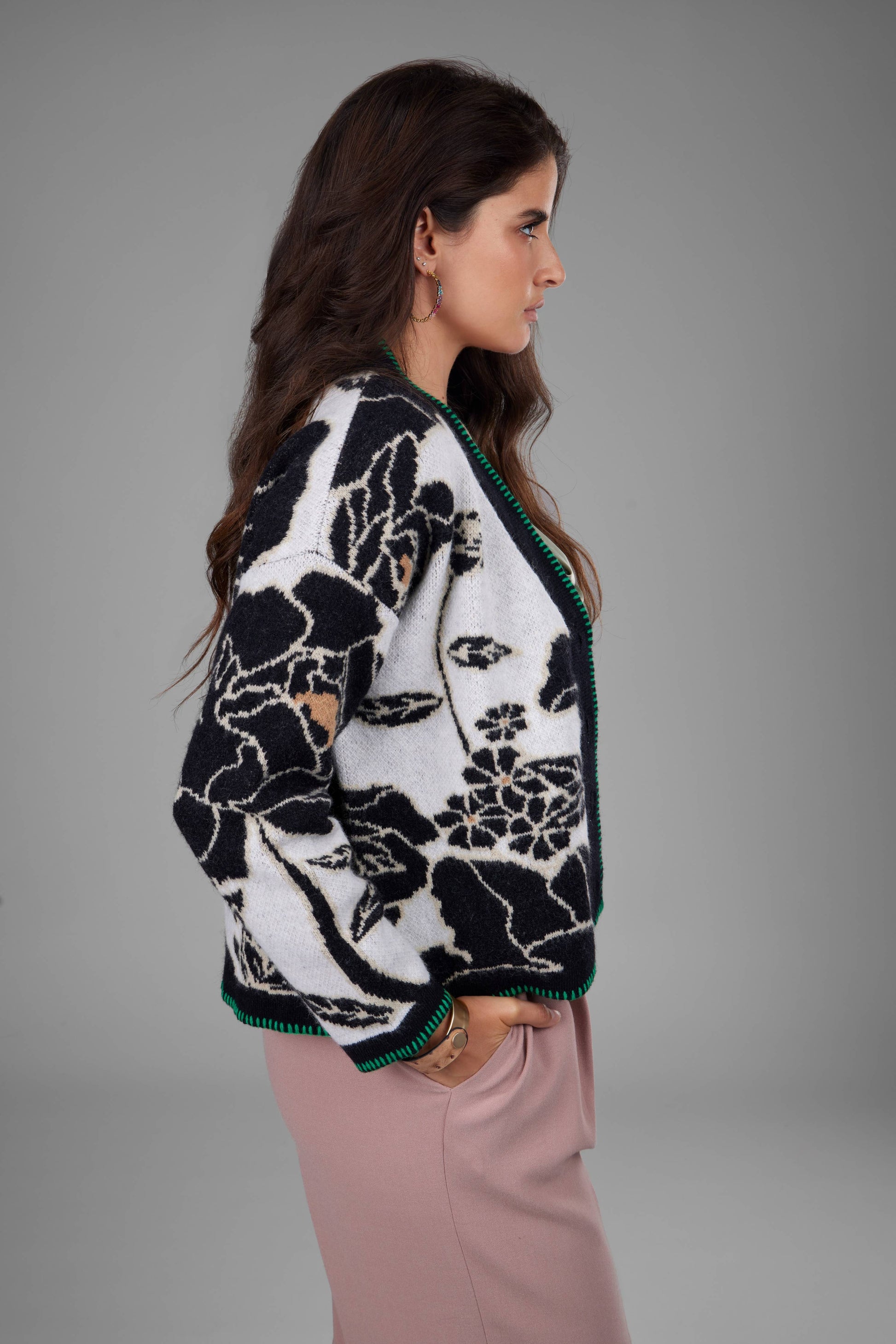 Embrace soft style and edge with our Abstract Floral Button Cardigan. This cropped cardigan features a black-and-white floral pattern with a contrasting green trim. Unique ringed buttons add an elegant and edgy touch. It's perfect for layering, offering timeless appeal and trendy flair. Pair it with jeans or a dress for effortless chic.