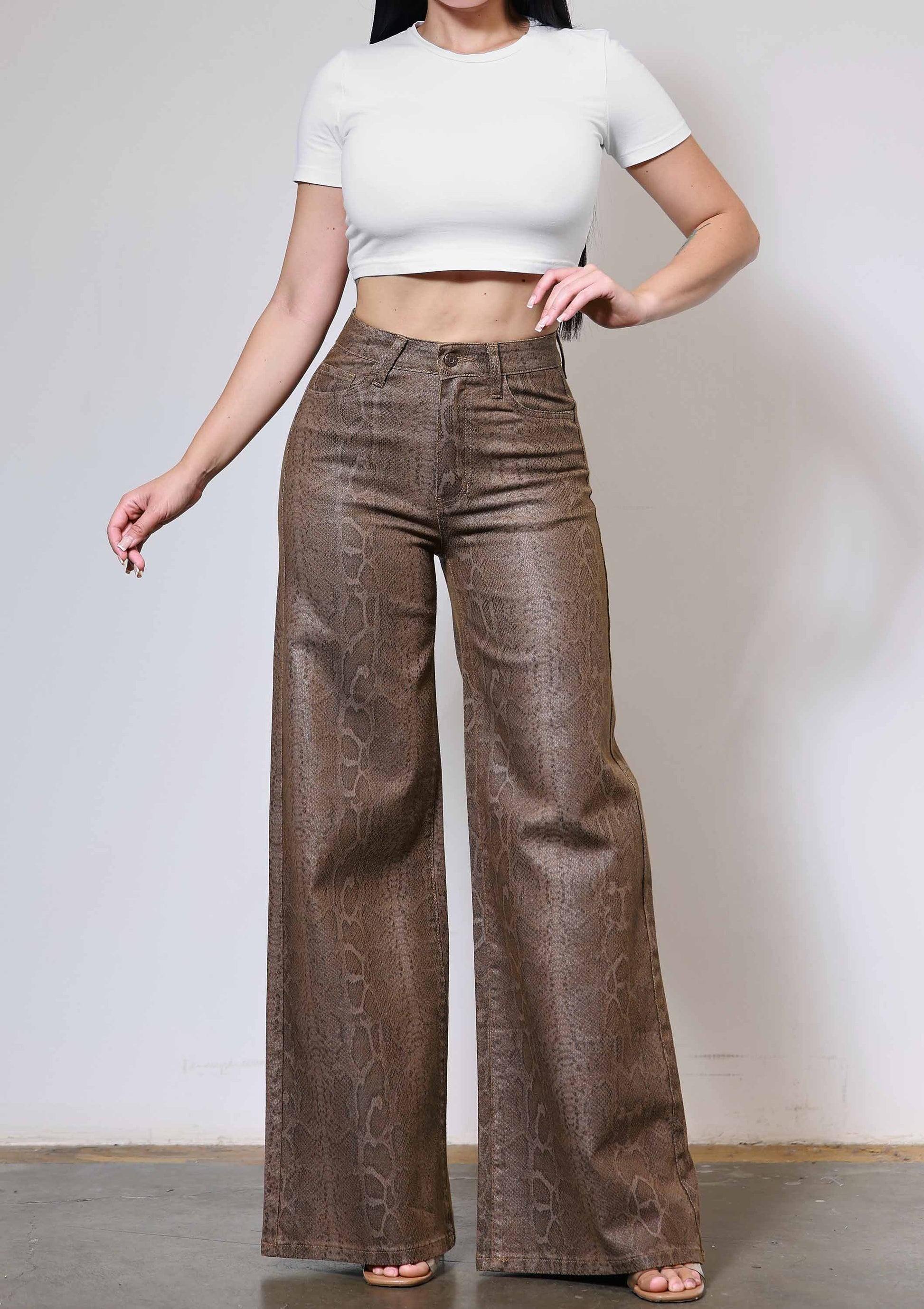 A pair of high-rise wide leg jeans featuring python print, 5 pocket construction and zip-fly closure.